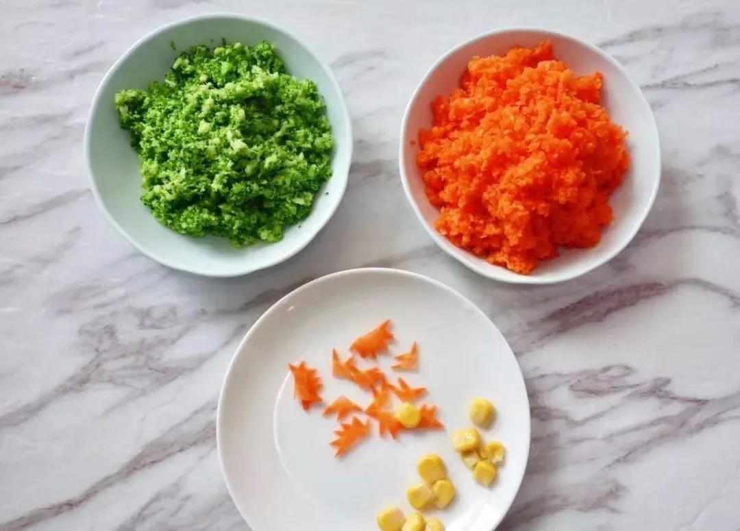 4. Divide the mixed rice into three portions, one portion is used to make the ugly duckling, and the two portions are mixed with chopped broccoli and chopped carrots.
