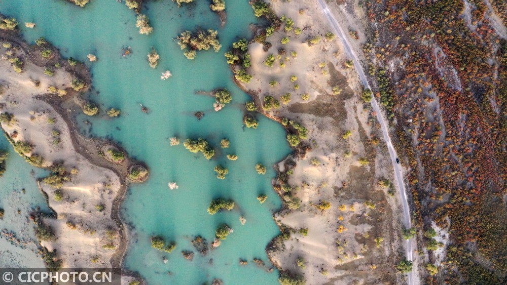 ↑On September 28, 2020, autumn colors in Yuli County, Bayingoleng Mongolian Autonomous Prefecture, Tarim River Wetland, Xinjiang. CICPHOTO/Que·Hu Hot Photo
