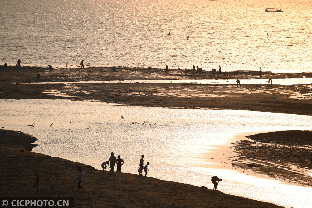 When the sun sets in the west, Jintan on the north coast of Guangxi Beihai Sea is at low tide on the beach. Some of the nearby villagers stepping on the tide line to bend over to dig for snails, some dig for snails in waist-deep waters, and nearby egrets roost for food in the shallows , Under the golden sunlight of autumn, it forms a beautiful landscape.