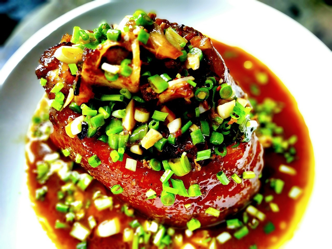 Next is the sauce: use minced ginger and bean paste with chili, sugar, soy sauce, etc. to make a beautiful and delicious sauce! Let the spicy ginger and the fragrant flavor of the bean paste fill the elbows. Finally, sprinkle the green onion diced and coriander moer, and a delicious Dongpo elbow is completed!