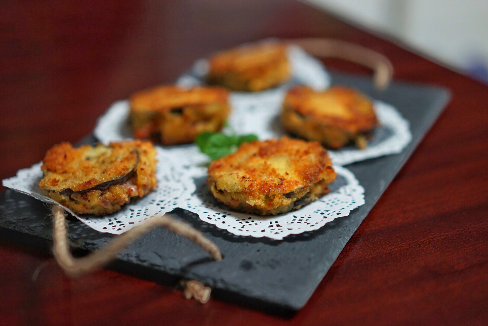 6. For our low-oil version of the eggplant box, put the oil in the bottom of the pan, and fry the eggplant box. It may be more difficult to fry. Be patient and put a few less at a time. It can also be successful.