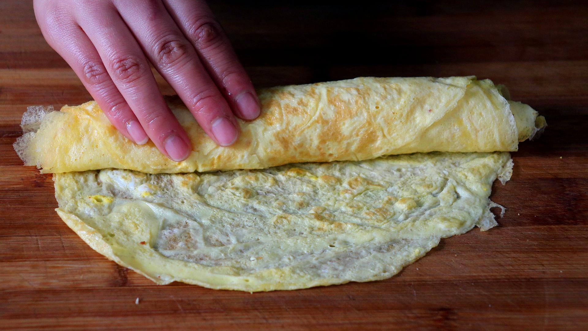 3. Heat the pan first, then pour the egg liquid into it and fry it until the bottom of the egg pancake is cooked. Let's turn it over and continue to fry. Take it out when both sides are cooked. The egg liquid we prepared can be fried several pieces, put the fried egg skin on the table, first roll up one, then put the rolled egg roll on top of the other and roll it up. , First cut off two sections, and then put on the pan.