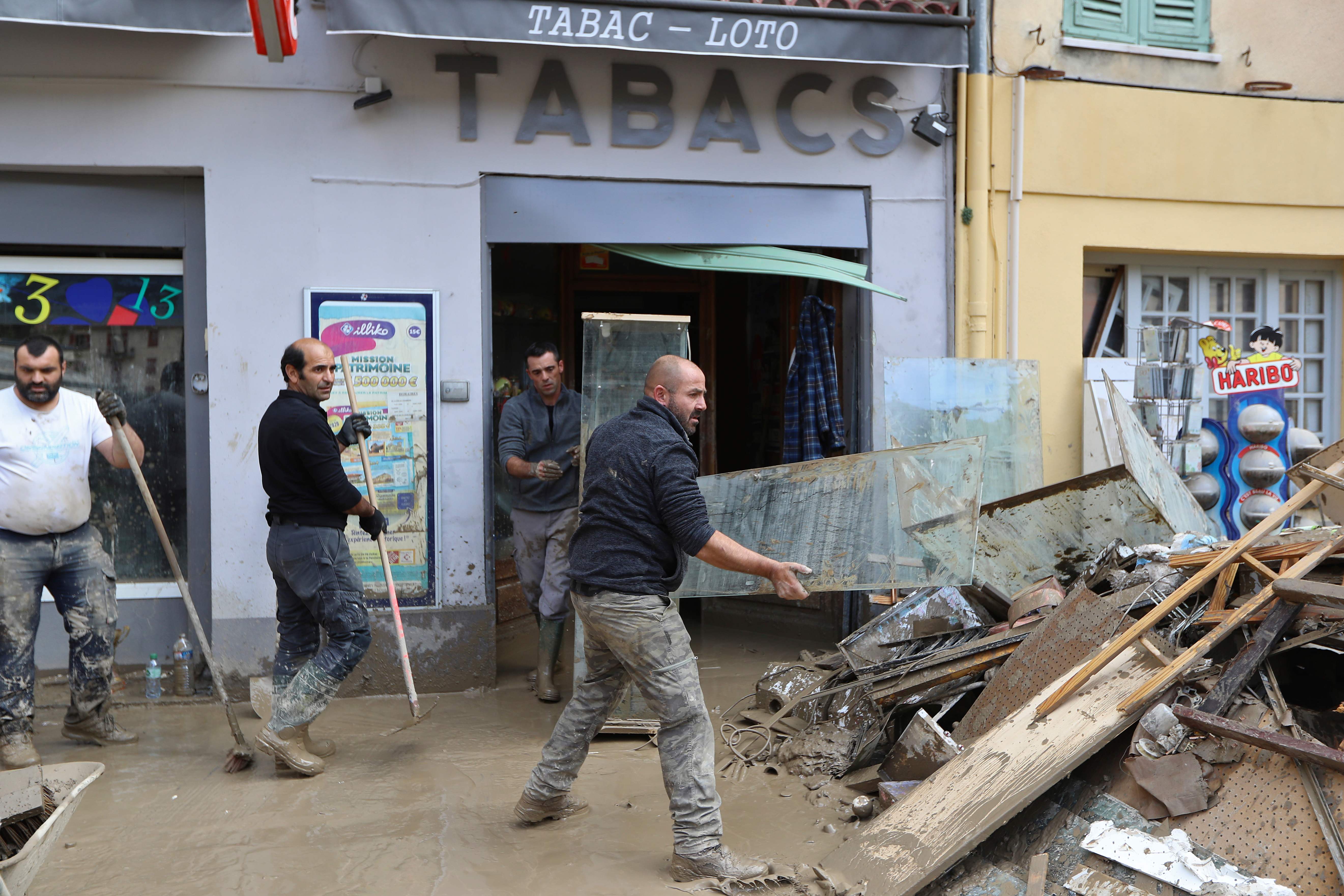 Photo from Xinhua News Agency, Waidai, October 6, 2020 (Foreign Frontline) (13) Flooding in France On October 5, people cleaned up shops destroyed by the flood in Brey-sur-Royat near the border with Italy. The areas on the border between France and Italy have recently experienced heavy rains and floods, and some mountainous areas have experienced landslides. Xinhua News Agency/AFP