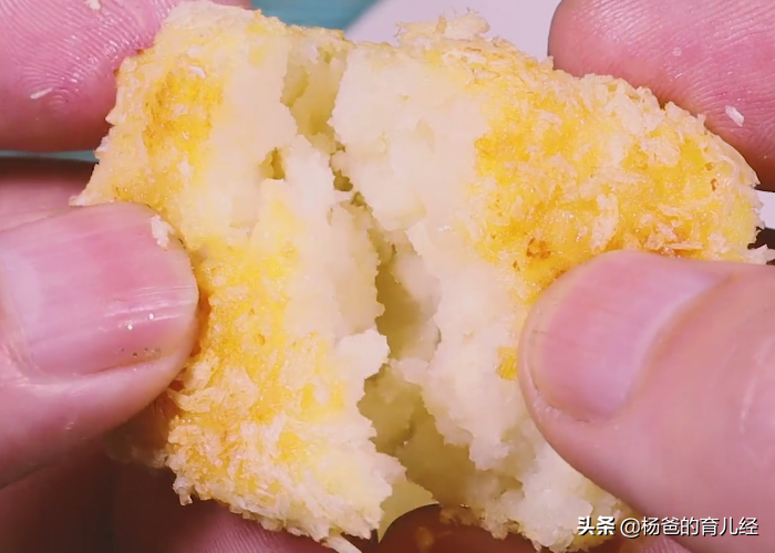 Just like today’s potato chicken pie, the author cooked this delicacy with a 1:2 ratio of chicken and potatoes. After the auxiliary blending of egg liquid and bread crumbs, a delicious and delicious parenting food was born in the form of frying. .