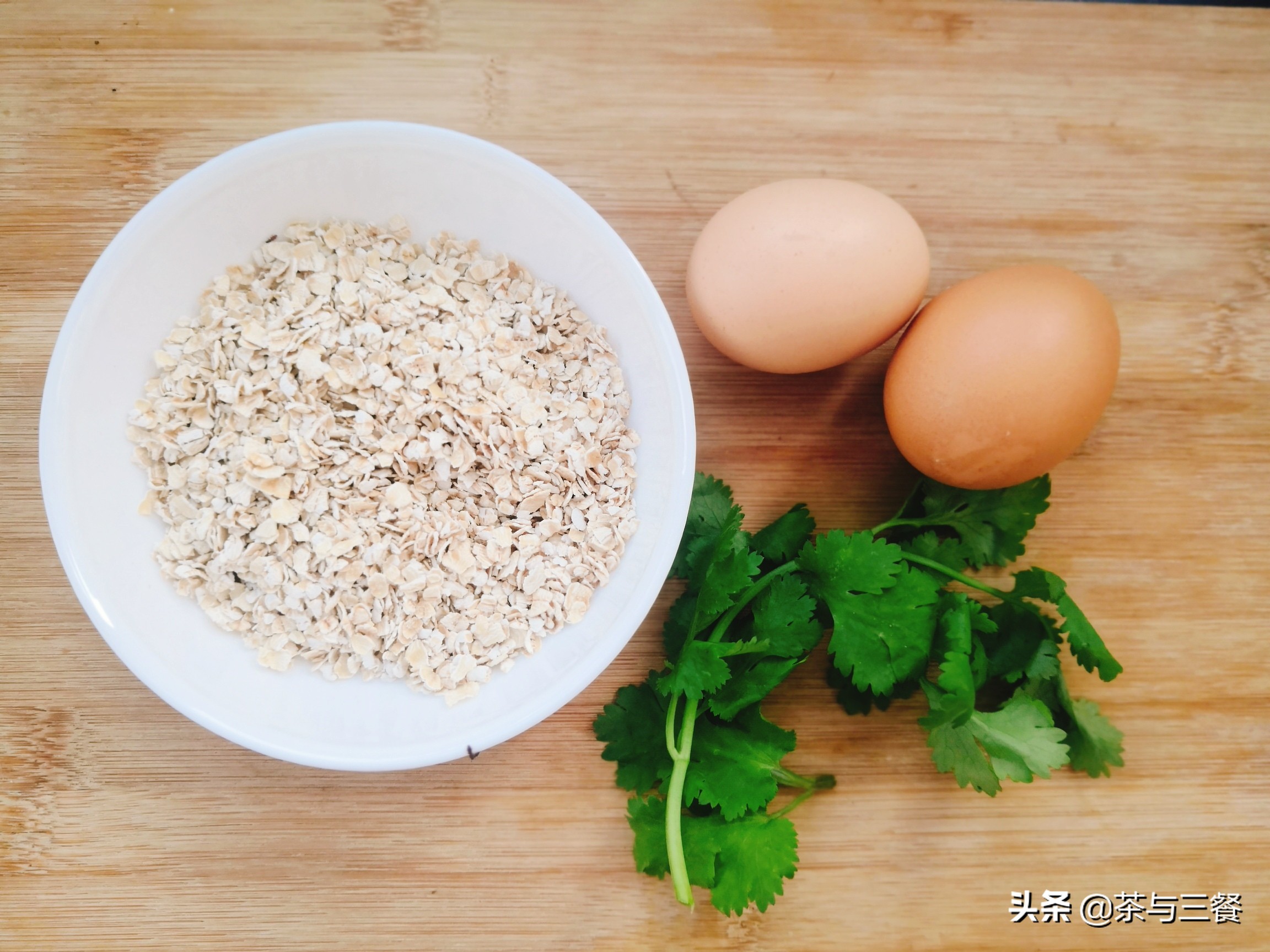 2 eggs, 40 grams of instant oatmeal, and appropriate amount of coriander leaves.