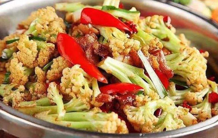 Next, we will tell you how to do it: cut green and red hot peppers, green onion, ginger, garlic, and dried chillies. Cut the pork belly into thin slices and set aside. Cut the cauliflower into small stalks, add enough salt to boil in boiling water for 1 minute, remove and set aside. Heat a proper amount of oil in the pan, heat the pan, add the pork belly and stir-fry until curled, then add the cooking wine and mix well. Add green onion, ginger, garlic and fry until fragrant, then add dried chili and mix well. Continue to stir fry with soy sauce and salt. Add cauliflower, mix well, add green and red pepper, chicken essence, and stir-fry evenly.