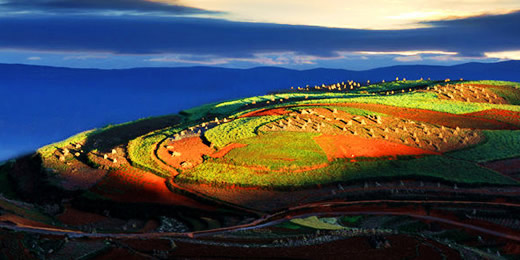 Dongchuan Red Land Scenic Area is considered by experts as the most imposing red land in the world except Rio de Janeiro, and its scene is more magnificent than Brazilian red land. From September to December each year, part of the red land is plowed for planting, and the other part of the red land has been planted with green barley or wheat and other crops. From a distance, it looks like a patch of color smeared from the sky, with brilliant colors and blue sky. , White clouds and the unpredictable light form the spectacular scenery of the red land.