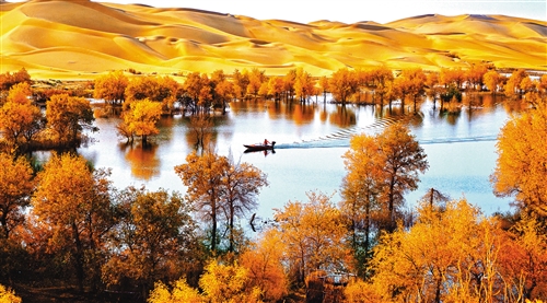 On both sides of the Tarim River in Xinjiang, tourists can enjoy the scenery by boating. The endless Gobi, the vast sea desert and millions of acres of Populus euphratica are reflected in the water, which is intoxicating. Photo by Wang Chuansheng
