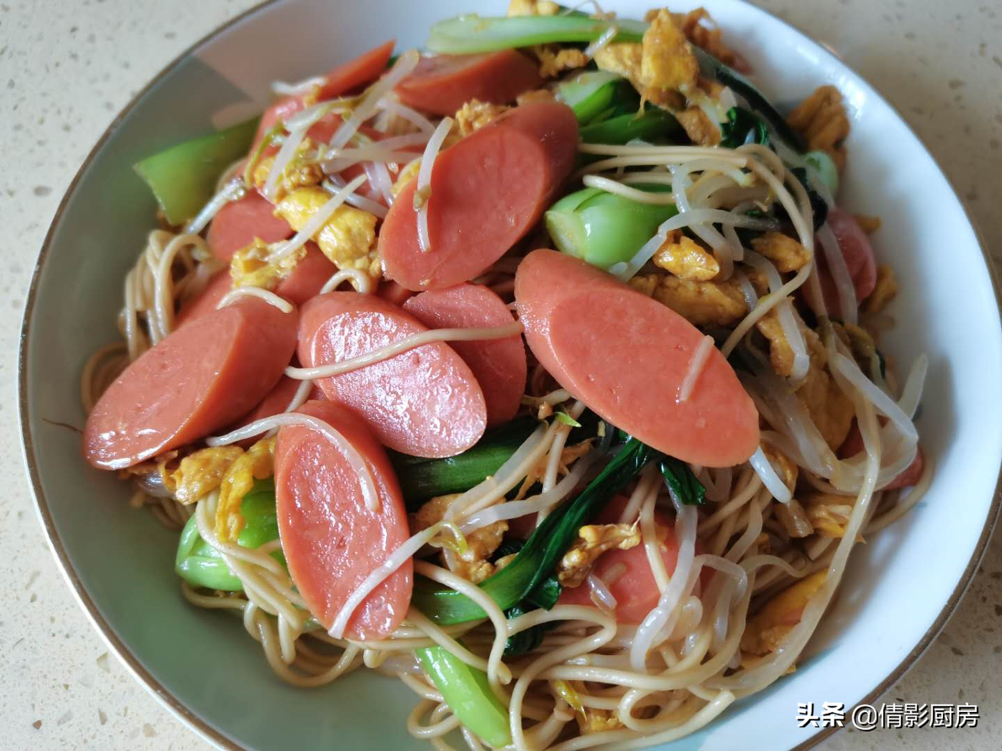 [Prepare ingredients]: Ham sausage, noodles, greens, mung bean sprouts, eggs, light soy sauce, sugar, salt, garlic cloves, cooking oil