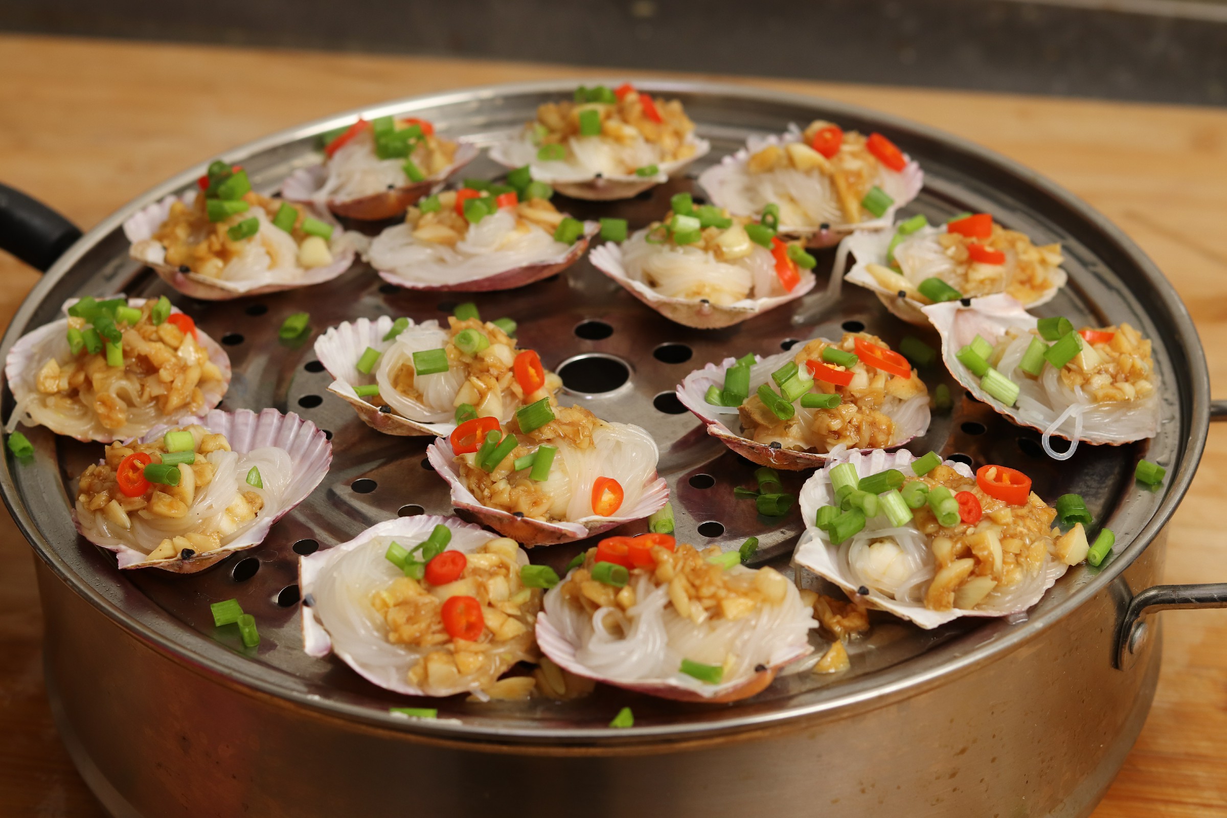 Ingredients: scallops, vermicelli, garlic, red pepper, light soy sauce, oyster sauce, salt, thirteen spices, pepper