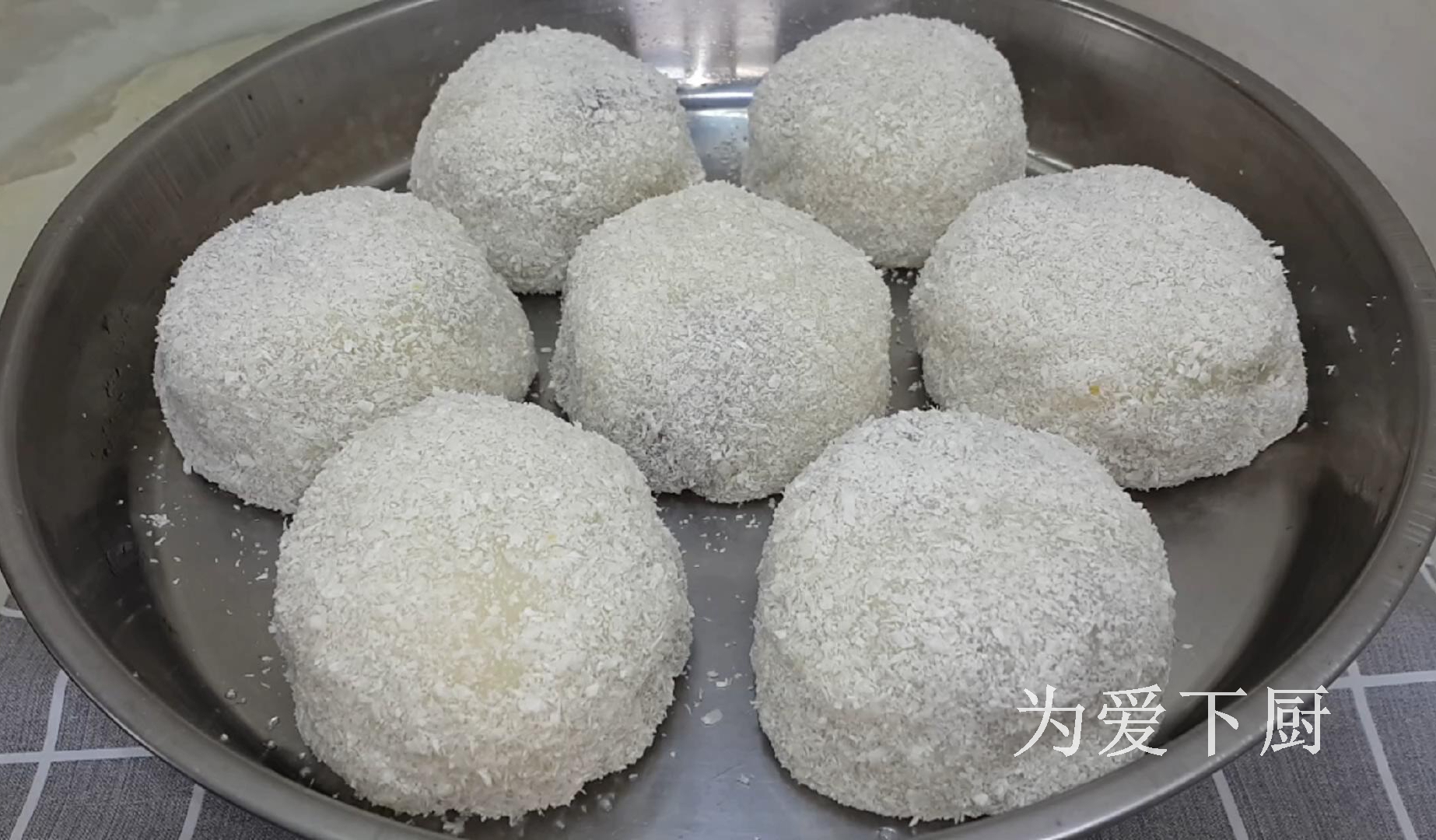 Pour the coconut powder into the plate, add the glutinous rice dough, and roll the plate around.