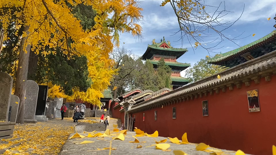 In late autumn, in the Songshan Shaolin Temple, the ancient ginkgo trees are golden and beautiful, attracting many tourists to come to play and take pictures. The largest ginkgo tree in the temple is 25 meters high and has a crown of 37 meters. After more than 1,500 years of wind, frost, rain and snow, it is still vigorous and upright, with lush branches.