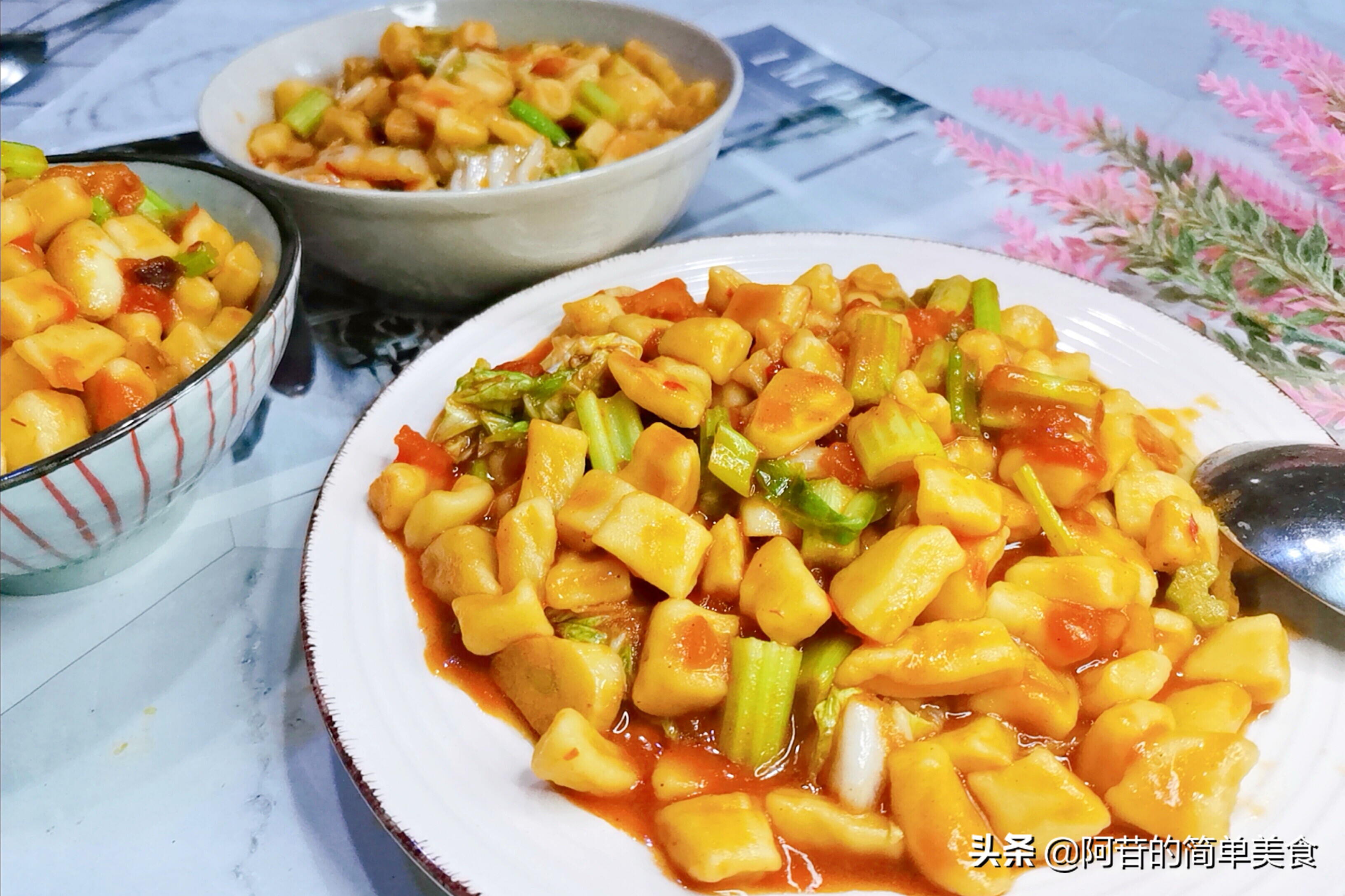 3. Roll the kneaded dough into thick slices, first cut into thick strips, and then cut into small dices with a knife. Sprinkle a layer of flour on the cut dice and mix well to avoid adhesion.